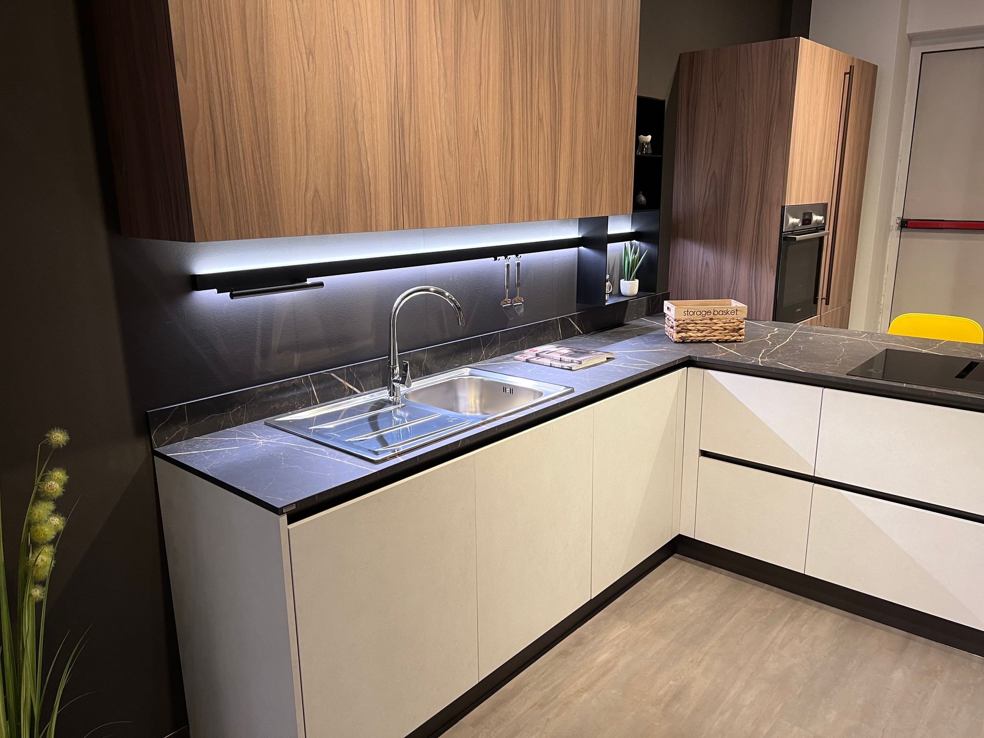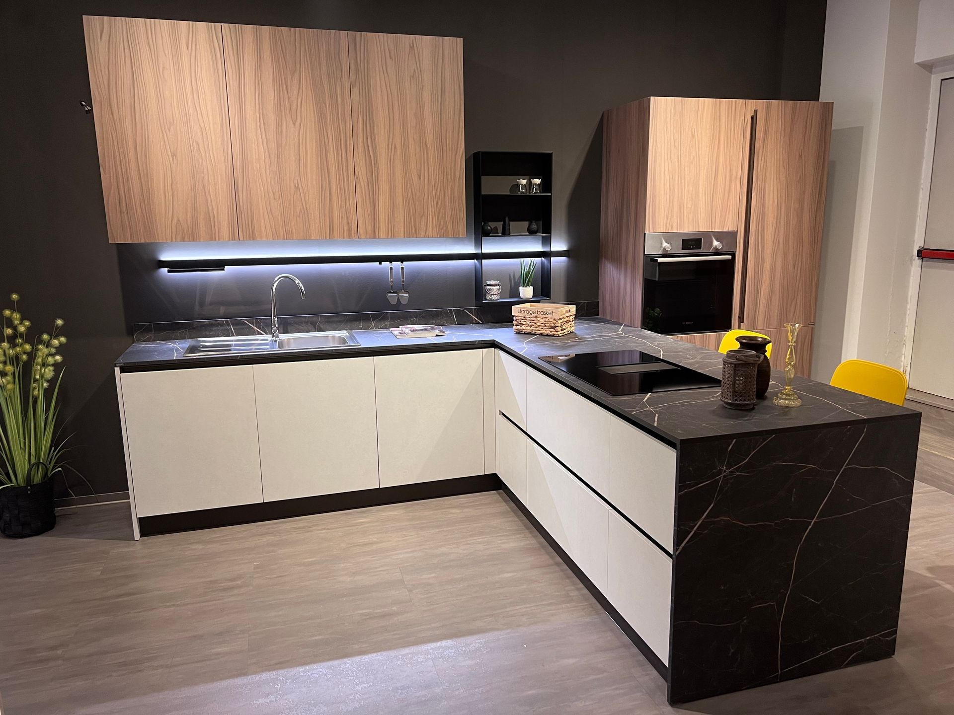Accessori: Vassoi estraibili angolari, porta posate da 45, set di pattumiere per anta da 60 e barra led luminosa con porta rotolo, 3 ganci e vano a giorno.