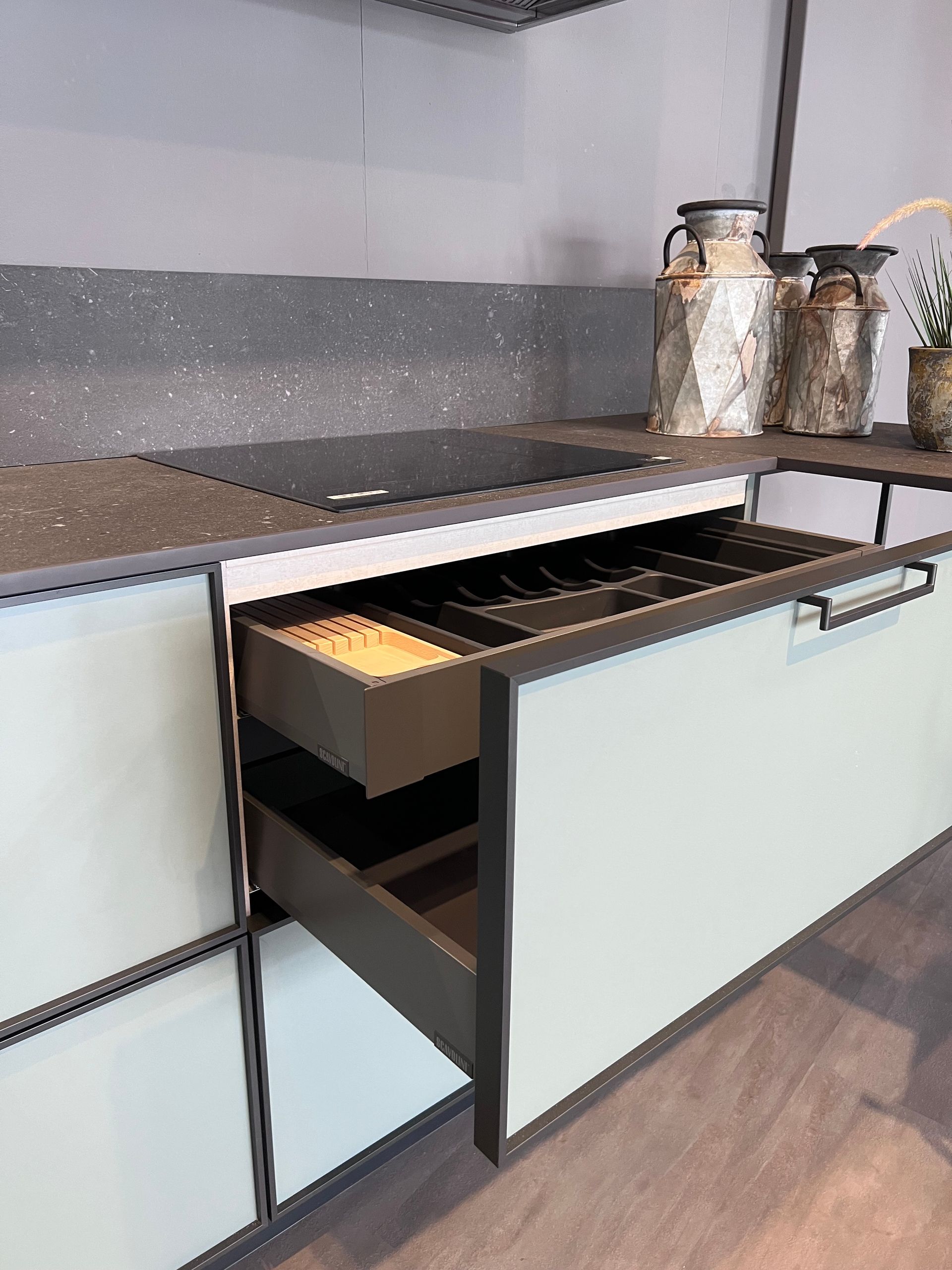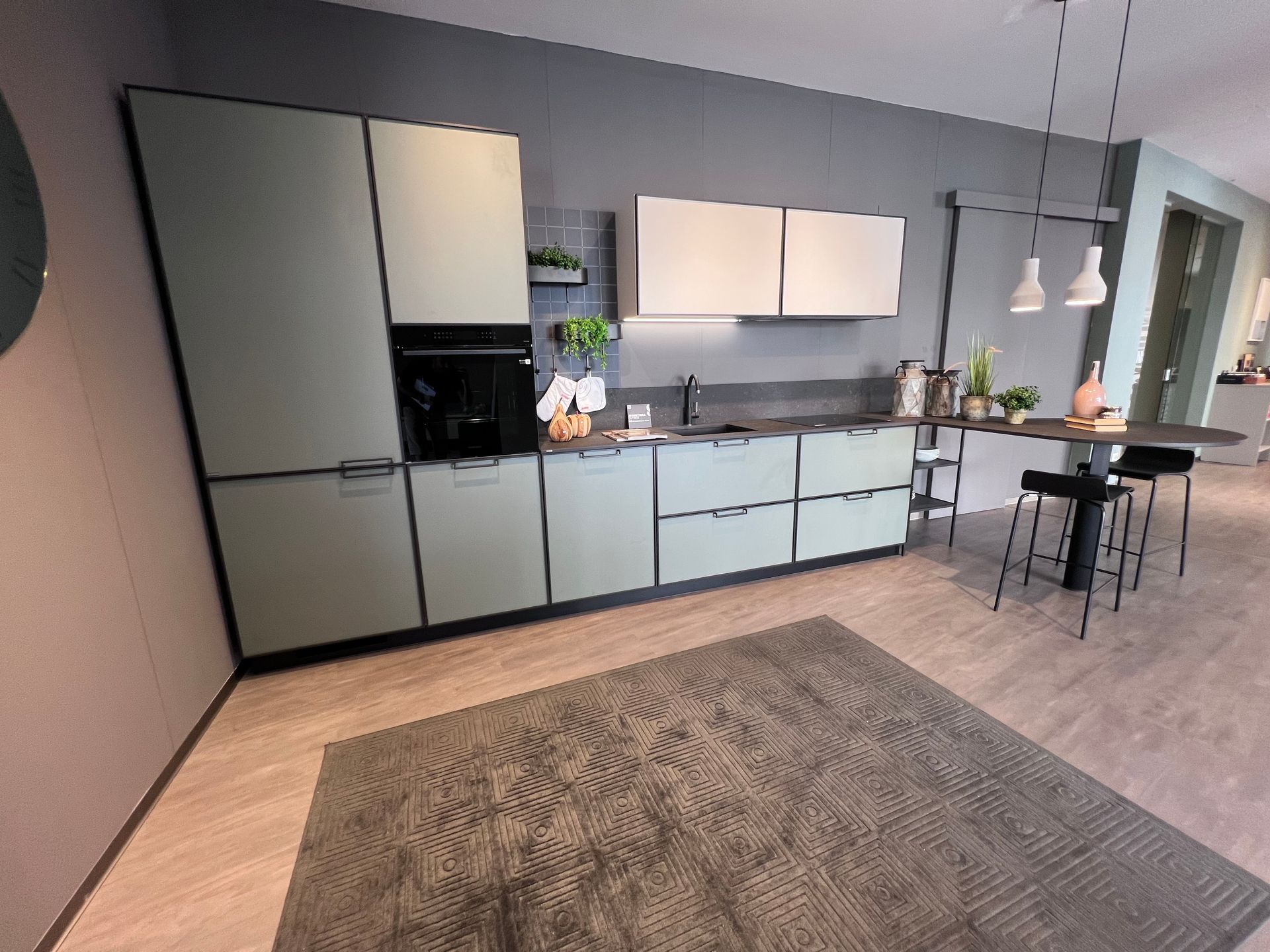 Materiale: Basi e colonne in decorativo finitura verde selva, pensili in decorativo finitura soft beige. Ante con profilo metallico finitura nero opaco.