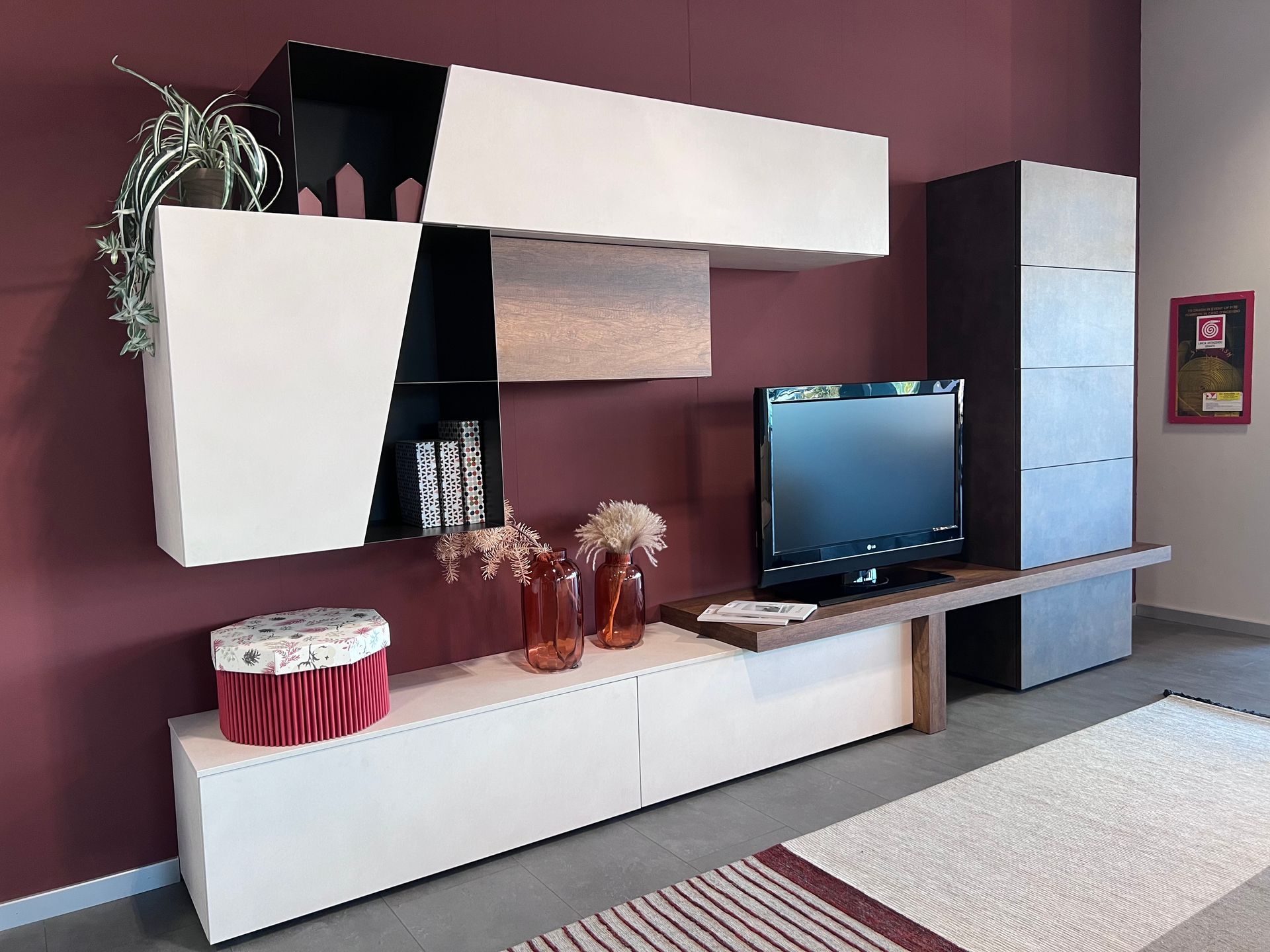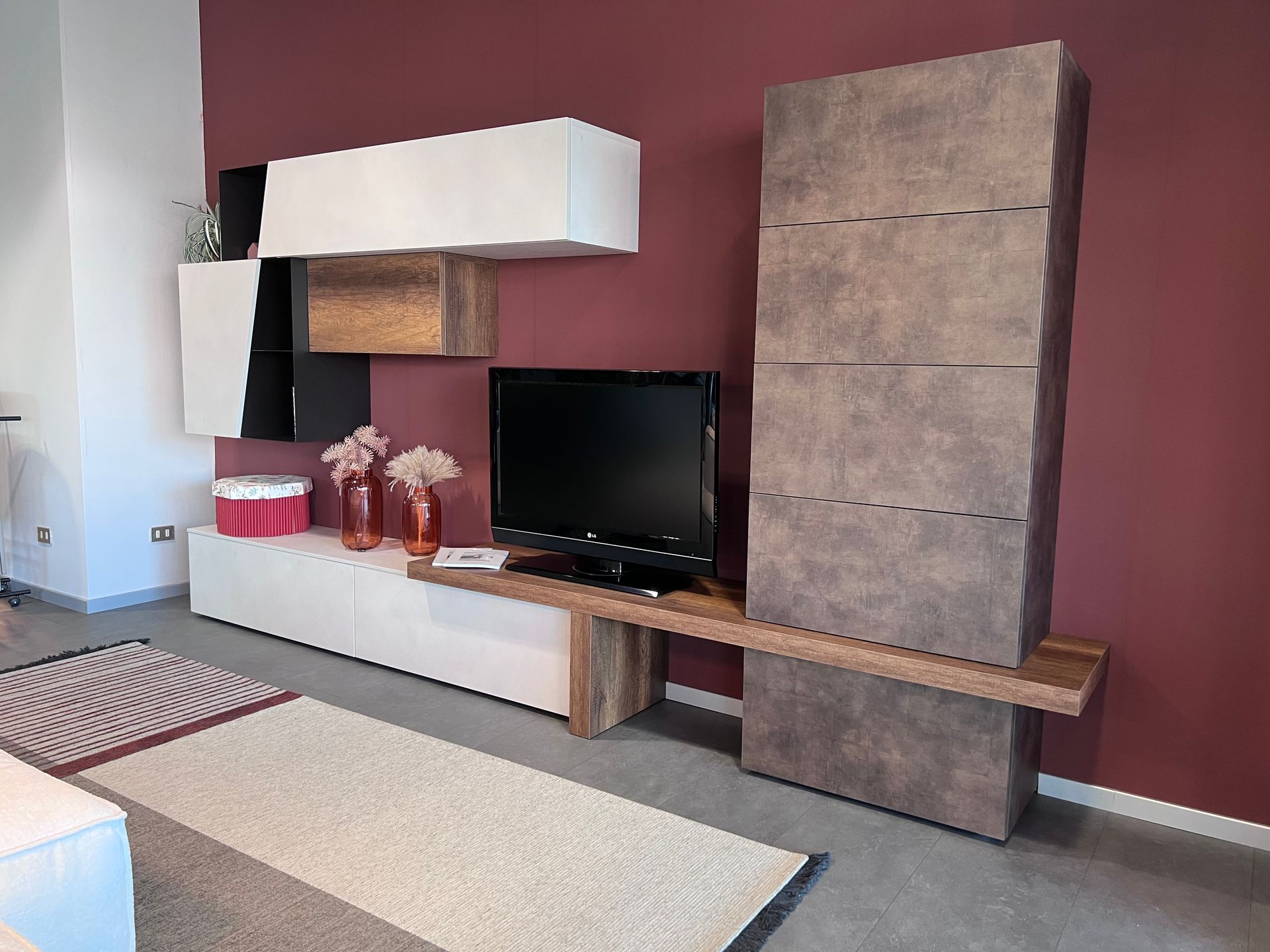 Materiale: Basi e pensile in finitura materico cemento chiaro, panka in appoggio in rovere nodato scuro, totem in finitura maya bronze.