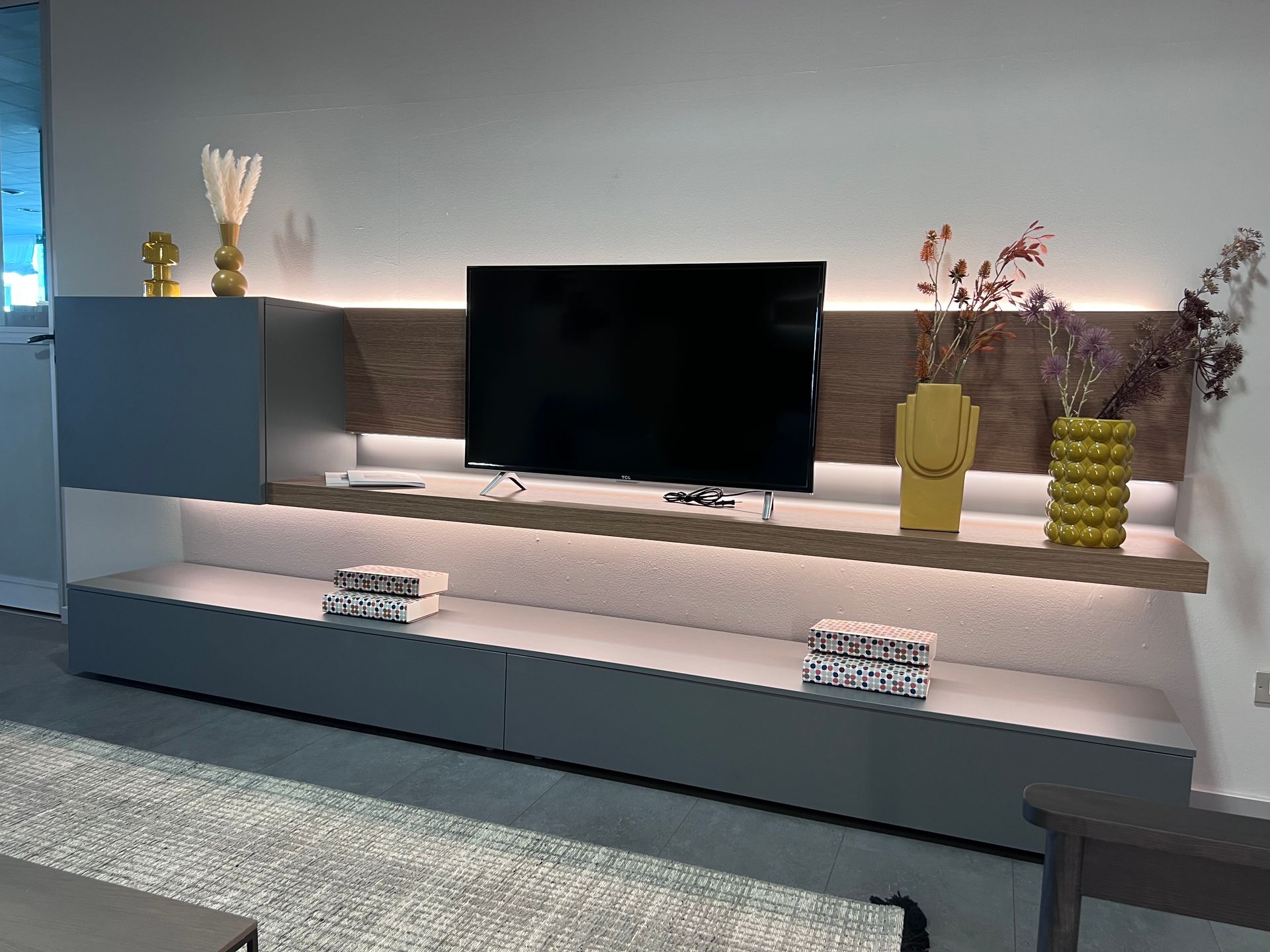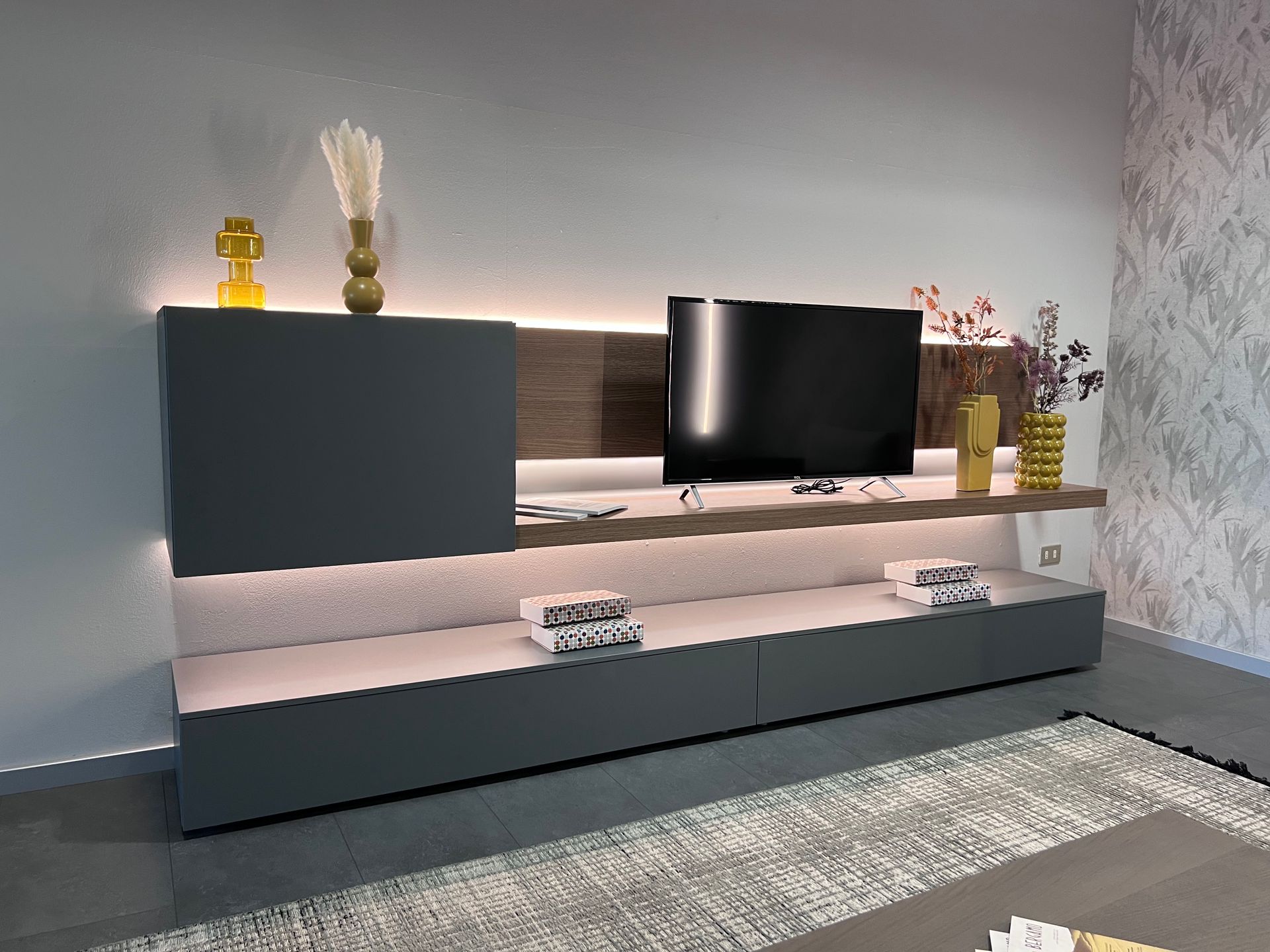 Materiale: Basi e pensile in finitura materico marna, schienale e bancone sospeso in finitura rovere cognac.